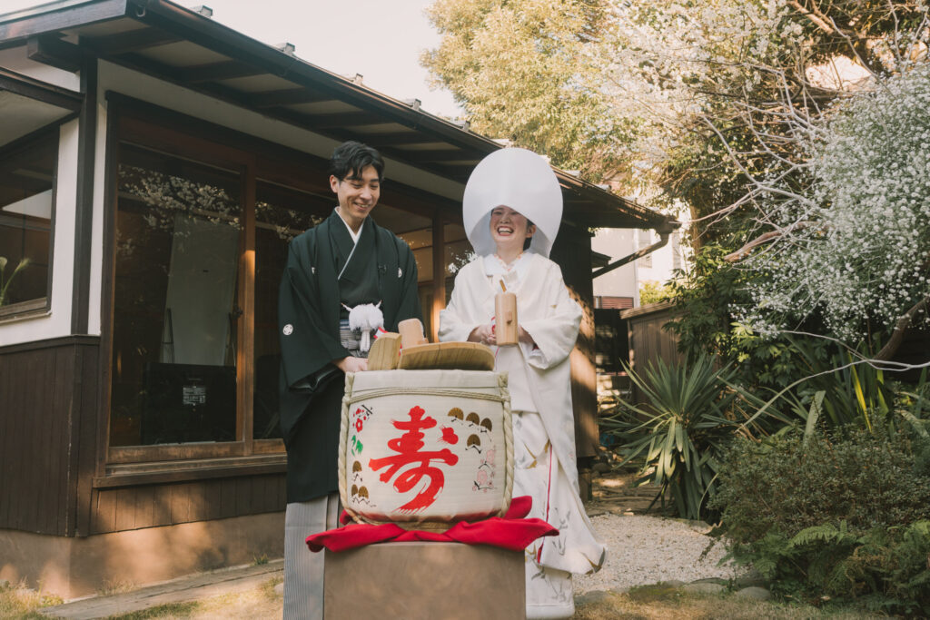 結婚の日2日目。ご両家で朝ごはんを囲みます。昨夜はご兄弟同士で朝まで語り合っていたと、少し眠そうにそれでも嬉しそうに教えてくださいました。支度が始まると、空気は少しずつハレの日へと身が引き締まります。白無垢に身を包む新婦さんと袴をお召しになる新郎さん、いつも通りの仲のいいお二人の空気感をそのままにゲストがいらっしゃる前にゆっくりと写真撮影が始まりました。