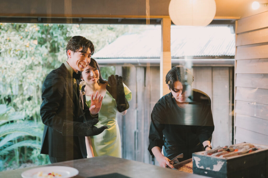 披露宴は、お二人が司会を行い、形式ばらずまるで食卓の延長のように過ごしていただきます。ケーキ入刀、ファーストバイトを行ったり、中座では、それぞれのご兄弟から一言をいただき、ご兄弟が揃う場面はご家族も嬉しそうでした。再入場は雰囲気を変えて、エプロン姿で鯛をふるまうお二人。お二人がオリジナルで作成したおみくじで盛り上がり、大吉、大大吉の方には、2人からのプレゼントとお二人がお肉料理を焼く特別な一皿を用意しました。特別な演出というよりその場にいる全員でつくる時間で、垣根なく皆様楽しまれていました。最後は親御様からの言葉と1日の様子を一つにしたエンドロールをみんなで見て今日の余韻に浸ります。玄関での送賓のあと、夜はご家族だけで飲み直したり、夕食を食べたり焚き火を囲みました。その様子は結婚式の続きというより、家族の時間でした。どうぞゆっくり過ごして行ってくださいね。とお二人の温かさが伝わるハレの日でした。