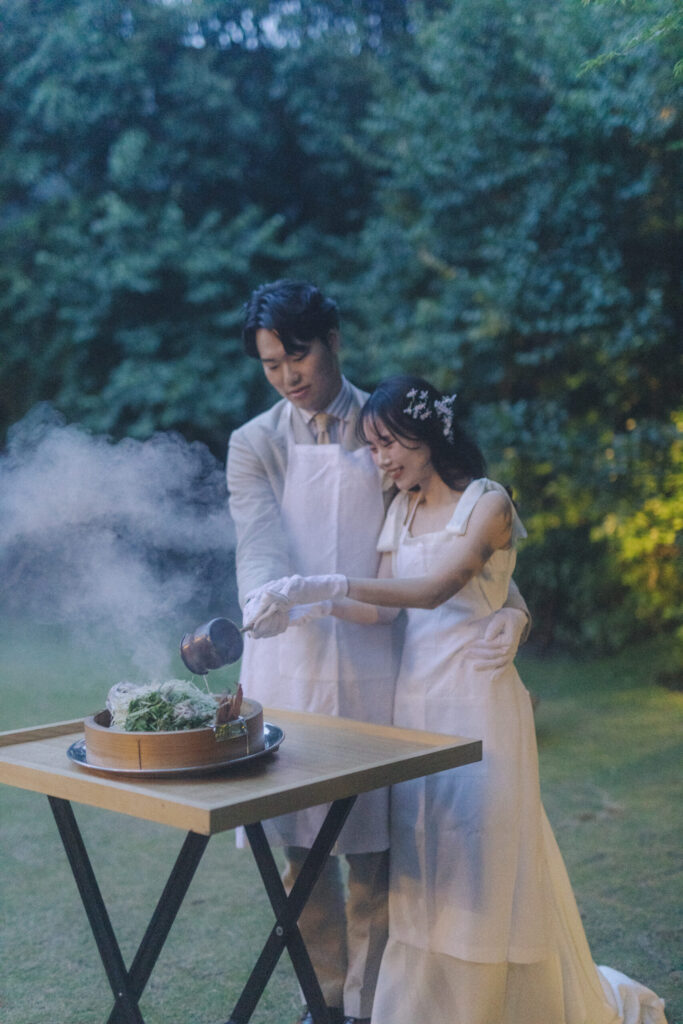 アイランドキッチンをみんなで囲み、餃子を一緒に包んだり、鎌倉野菜を蒸籠で蒸したり、土鍋でご飯を炊いたり、穏払いやかな夜のはじまりは、おふたりにとっても、ご家族にとっても、ご両家同士が家族になる結婚という時間を迎えるための、準備のようでした。