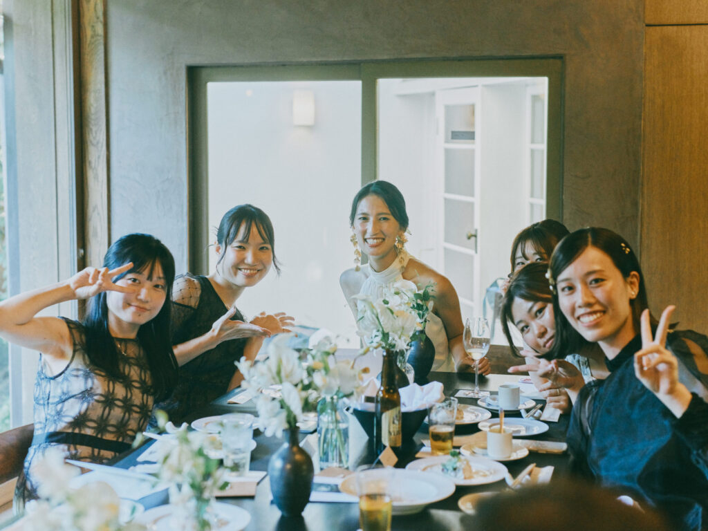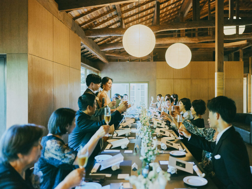 お食事会のお時間は、家族や友人を招いて20名さまで過ごされたお二人は、流しテーブル1つに全員で横並びに並んで食卓を囲みました。