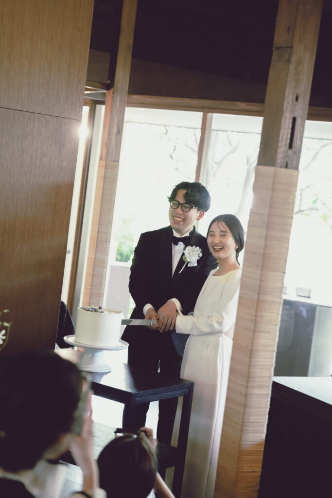 続くケーキセレモニーでは、ケーキカットとファーストバイトが行われ、ゲストの皆さまに見守られながら、笑顔あふれるひとときを過ごされました。