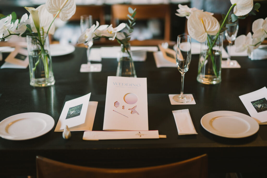 デザインやアパレルのお仕事をされているお二人は、この日のためにたくさんのアイテムやギフトをご自身で作ってくださいました。ゲストの皆様をお迎えする玄関の暖簾、お二人の生い立ち、出逢いから結婚の日を迎えるまでのエピソードが書かれたプロフィールブック、ギフトを入れるトートバック。
