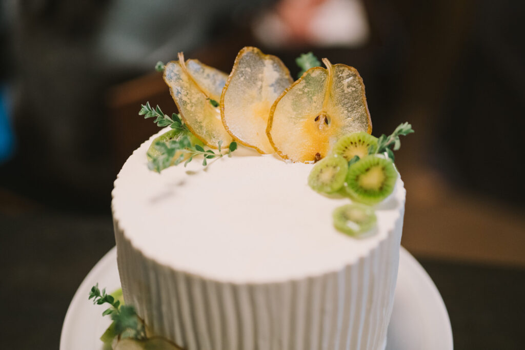 そしてゲストの皆様が一番驚かれていた、お二人が一からデザインをされてオーダーした洋梨を使ったウェディングケーキ。