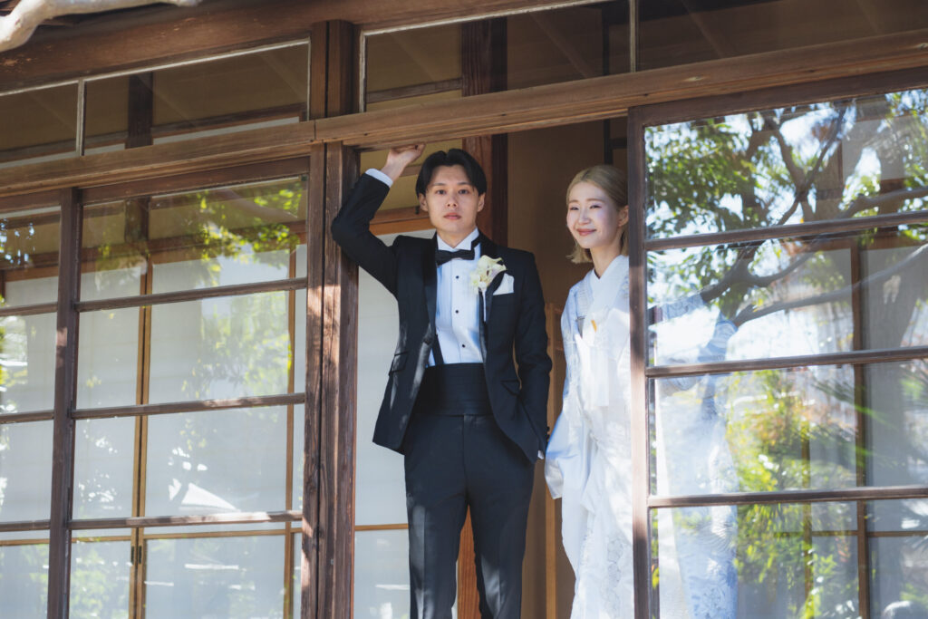 新婦様は白無垢、新郎様はタキシードをお召しになり写真撮影。