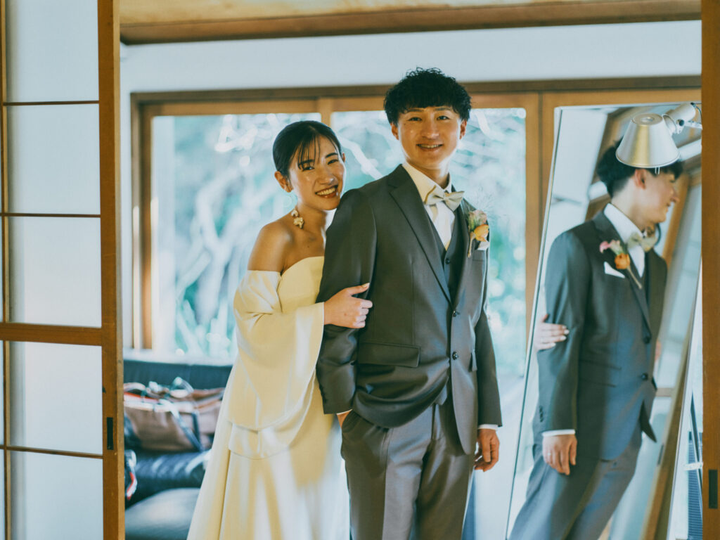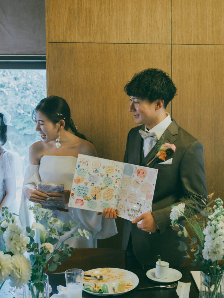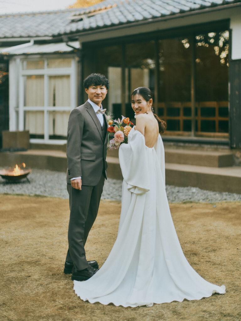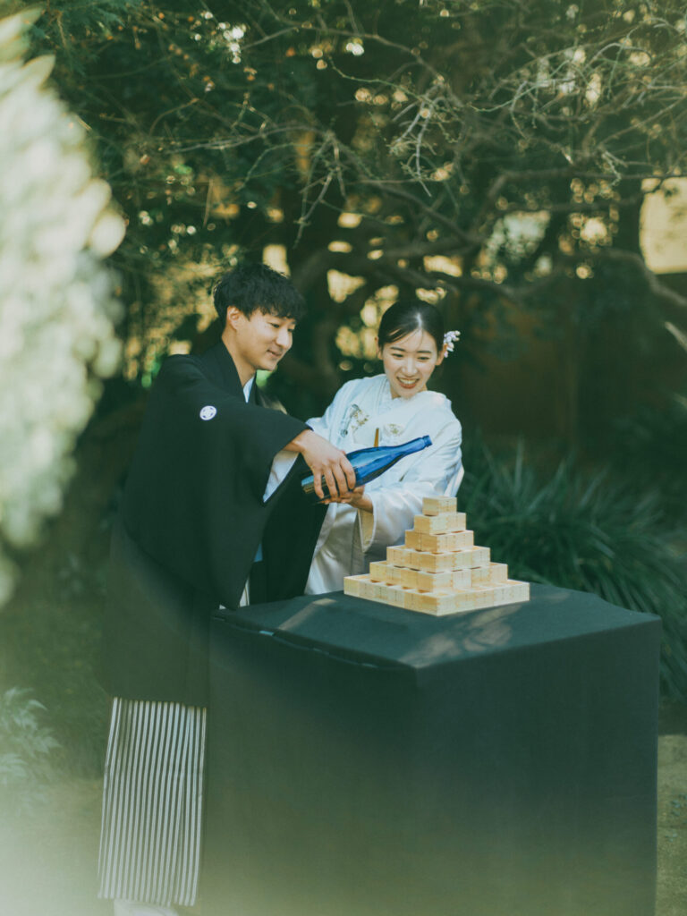 おふたりが選ばれたのは一泊二日の結婚の日。初日にハレの日を過ごされました。朝もチェックイン時間ぴったりにお越しいただき、事前の準備もバッチリ。慌てることなく、ゆっくりとした朝を過ごしていただきました。会場の準備を整え、お支度へ。新年にぴったりの和装をお召しになられました。細かい刺繍のご衣装にヘアメイクもしておふたりの素敵な姿にみんな大絶賛でした。清々しい空気の中、ガーデンにて挙式を。挙式の中では甥っ子さんが神父さんの役を演じて頂きました。衣装もきて、元気に話されていて、その姿を見てとっても感心しました。また、和装にぴったりな枡タワーのセレモニーを行い、みなさま一人ひとりにもお配りし乾杯!をいたしました。そのあとはみなさまでお食事会を。はじめてお会いする方もいらっしゃるということでゲスト紹介をしてスタートいたしました。ゲストとの距離も近いため、気を張りすぎず、自然と仲良くなるようなスタイルのため、みなさま自由に歩き回って過ごされておりました。MAYAオリジナルの鯛パフォーマンスも大盛り上がり。お子様もたくさんいらっしゃりとても和やかなご披露宴でした。また、みんなで集まろうね!そんな気持ちでお見送りをしました。夕方より、ご友人様を立食パーティーへお招きいたしました。おひとりおひとりがお好きな乾杯ドリンクを作り、みなさまで乾杯をされました。まずは、一部ご親族で執り行われたエンドロールムービーをみてスタートです。このお時間は鎌倉まできていただいたご友人様に楽しんでもらうために、沢山のコンテンツを考え、2時間を有意義にお過ごしいただきました。プロジェクターと使いながらゲームをし、豪華な景品に盛り上がり、ものすごくたのしまれていた様子でした。そんな楽しい時間はあっという間で、おふたりはゲストをお見送りし、この日はご友人様とMAYAで宿泊を。お開きのない夜をお楽しみいただきました。