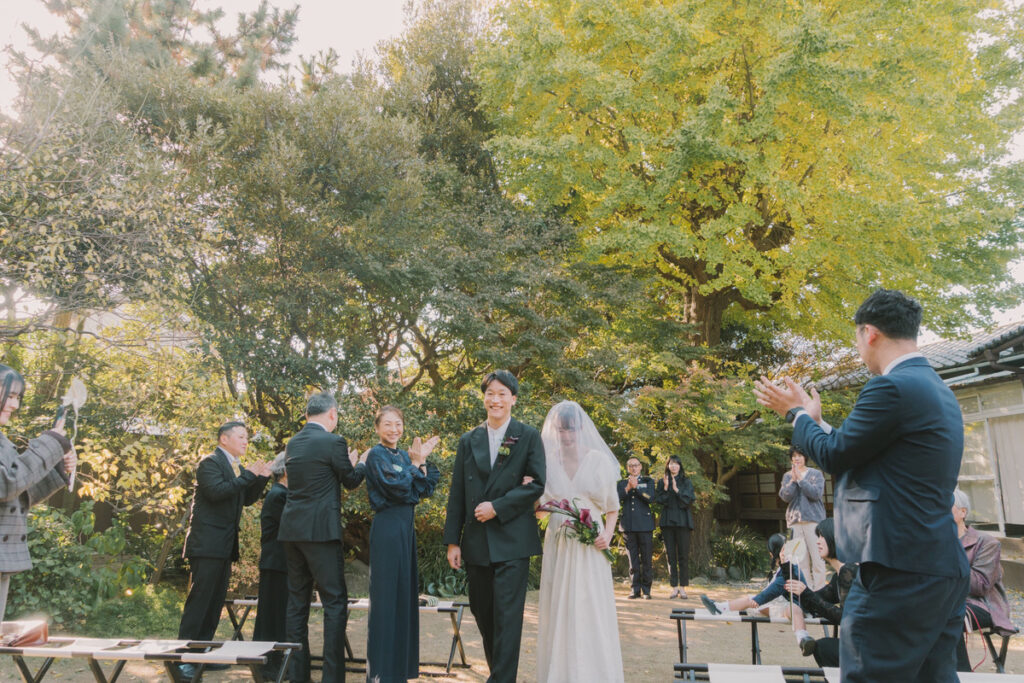 ご家族へ誓いを立てるお庭での人前式は、親御様へご入場のお手伝いをしてもらいました。その姿を見守る皆様の目には自然と涙が浮かんでいました。誓いの言葉では、これまでの想いや今の気持ち、今後への想いを丁寧にお互いに言葉にして伝えました。相手のことを大切に思う気持ちがまっすぐに伝わり、ご家族もお二人の関係性に安心されたご様子でした。そして、指輪の交換ではお二人が運んでもらいたいと指名された新郎妹さんと新婦姪っ子さんにリングガールをお願いしました。