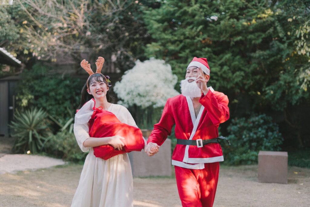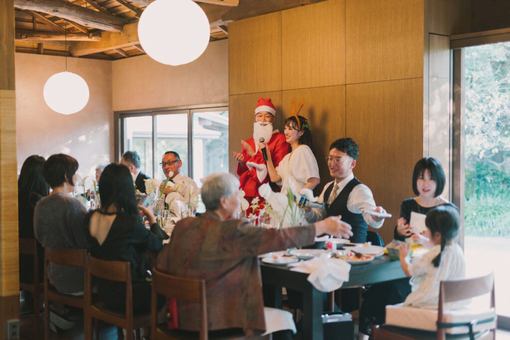 お二人が楽しみにしていたプレゼント交換のイベントでは、新郎さんがサンタクロース、新婦さんがトナカイになってお庭からプレゼントも持って登場しました。思わずご家族も立ち上がるほどの盛り上がりです。「ミュージックスタート!」の合図でみんなでプレゼントを音楽が止まるまでぐるぐると回し、「ストップ!」の掛け声で、手元にあったプレゼントを受け取ります。お子様からお祖母様まで一生懸命プレゼントを、回す姿がとても印象的でした。