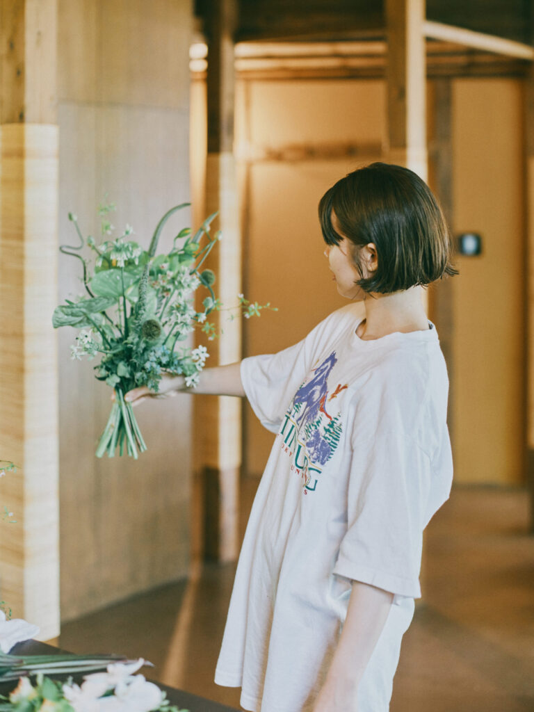 お花の知識が豊富なご新婦さまの希望により、ブーケはご自身の手で手作りされました。苔丸さんと一緒に選んだ草花を並べながら、組み合わせや色味にこだわる時間は、おふたりらしい穏やかさと繊細さがあふれていました。