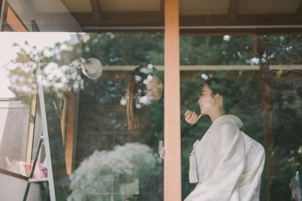 お二人はいつも通り、周りの方一人ひとりに丁寧に声をかけ、その姿から、お二人がどれだけ多くの方に愛されているかが伝わってきました。お二人を担当するメイクさんは、新婦さんがお仕事で関わりを持つ方で、お支度部屋から賑やかな声がずっと聞こえてきました。たくさんの方々を招いたお二人は、披露宴、挙式、立食パーティーと1日かけて大切な方々とゆっくりと過ごされるお時間を選ばれました。