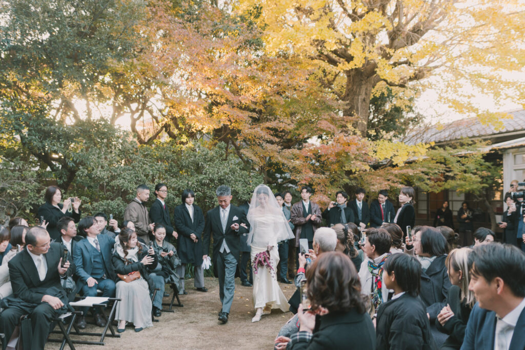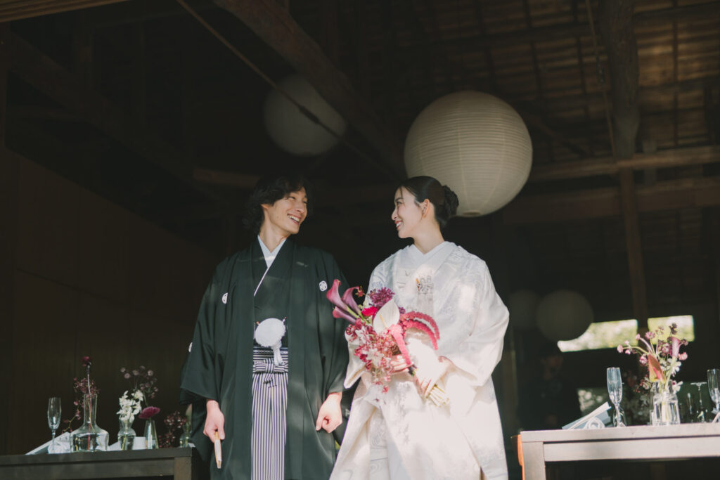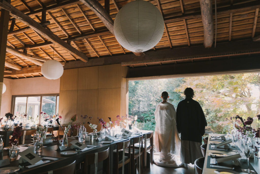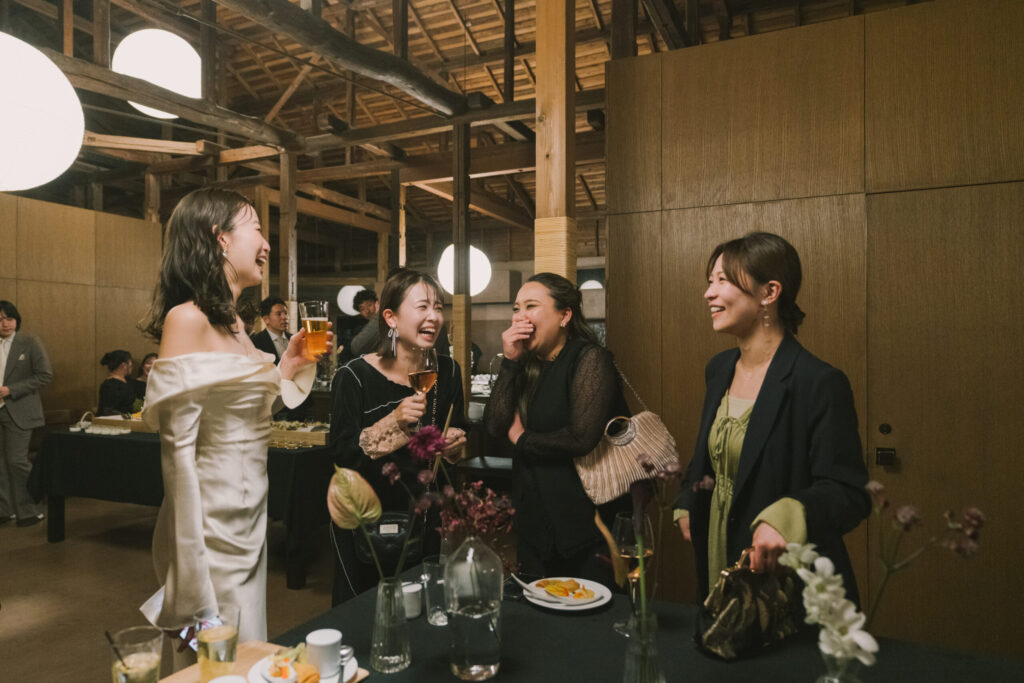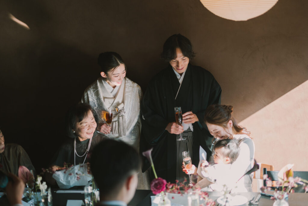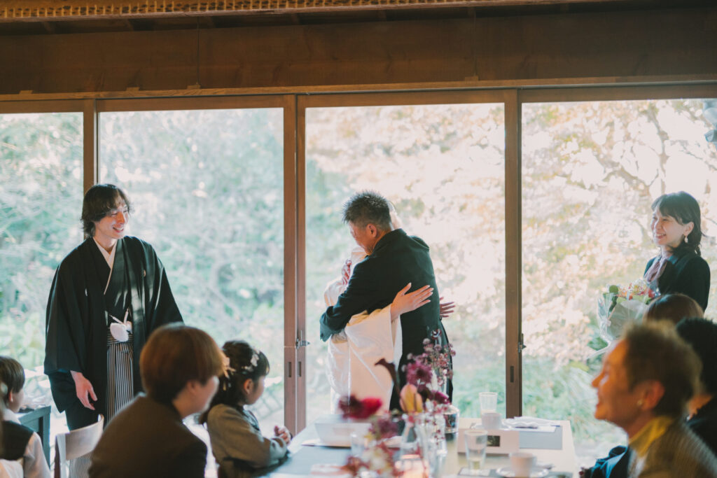 挙式と披露宴では、ご家族やご友人に見守られながら、言葉と想いを交わす時間。たくさんのイベントを設けるのではなくて、一人一人と話したりお写真を残したり、言葉にしてお話することを何よりも大切にされました。結びには、普段は涙を見せることのない新郎さんの瞳から涙が溢れました。この日だからこそ聞くことのできたご両家ご家族の想いに、会場全体が静かに包まれました。夕刻からは立食パーティーへ。宿泊されない方も22時まで一緒に過ごすことができ、写真を撮ったり、語り合ったり、海外のご友人からのビデオメッセージや、お二人が考えたイベントを行い、笑い声の絶えない時間が続きます。「おめでとう」その言葉の一つひとつに、これまでのお二人の歩みを見守ってきた時間が重なっているようでした。