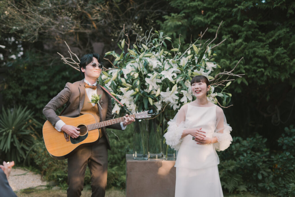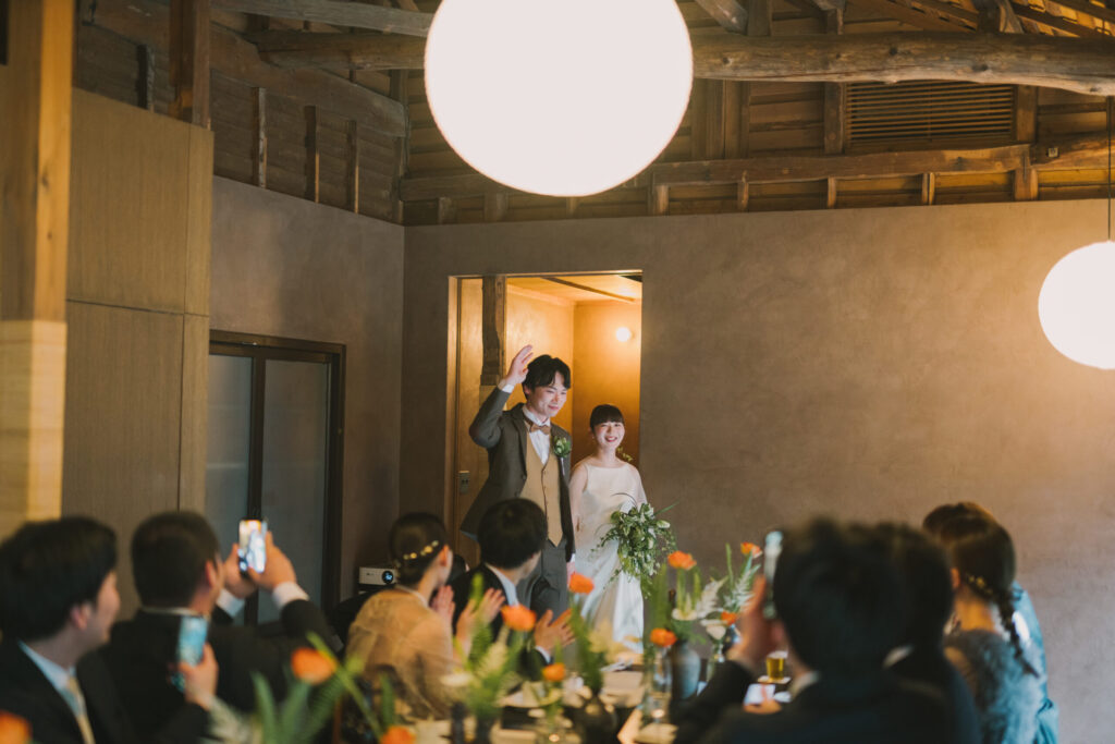 外からの良い光に照らされて、朝を迎えます。みなさまで朝食をお召し上がりいただき、それぞれお支度に入られます。お仕度前にのんびりコーヒーを淹れるお時間、そして陽が当たる温かい場所でたそがれたり、それぞれが自由に朝の時間を過ごされていました。MAYAのお家の中には、おふたりが作られたお正月の置き物や凧、ご自宅からお気に入りをお持ちいただきました。おふたりはまずは和装をお召しになられます。新年に相応しく、選ばれたご衣装もお似合いになられておりました。この日はお天気にも恵まれ、ご家族のみなさまも含めお写真撮影を。みなさまおふたりの素敵な姿にカメラを向け、心から喜んでいらっしゃる表情が私たちも幸せな気持ちになりました。受付もおふたりのご希望でご自身で行いました。おふたりが玄関で皆様をお迎えし、お庭でフラワーシャワーの花道を通り、今日という日が素敵な一日となりますように。そう願ってご披露宴をスタートしました。ご披露宴は二時間半。基本的にはゲストの皆様とのお時間をたっぷりと。その他、中座をされ和装から洋装へお色直しをされました。その際、新郎さんはお母様に、新婦さんはご友人様にエスコートをしていただき中座されました。披露宴のメインイベントでもあるケーキセレモニー。今回は、新婦さんのご友人様がパティシエさんということでこの日のためにウエディングケーキを作っていただきました。当日までどんなケーキができるかサプライズでしたので、ケーキが運ばれてきた瞬間、嬉しさが溢れ涙をされておりました。ケーキはおふたりをしっかりとイメージされており、この日のためにご準備いただいたご友人様との関係性を深く知ることができました。ケーキは作ってくださったご友人様がおひとりおひとりに切り分けてくださり、結びまで思い思いにお過ごしいただきました。ご披露宴後は、おふたりが準備されている余興のお時間。お庭を使って新郎新婦より演奏と歌のプレゼントをされました。アットホームで、MAYAだからできることなんだなあと改めて感じることができました。この日はご友人様との宿泊。みなさまでしゃぶしゃぶを囲みながらのんびりと夜を過ごされました。