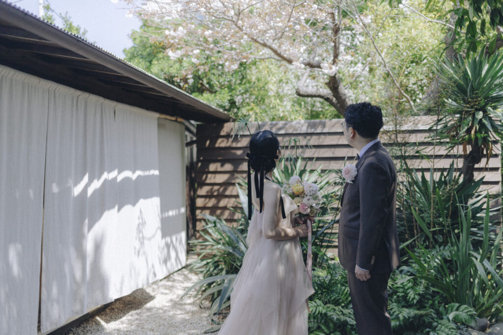 そして、ご家族を招いてお庭にて挙式を執り行います。全員が一堂に集まるお庭での時間。
